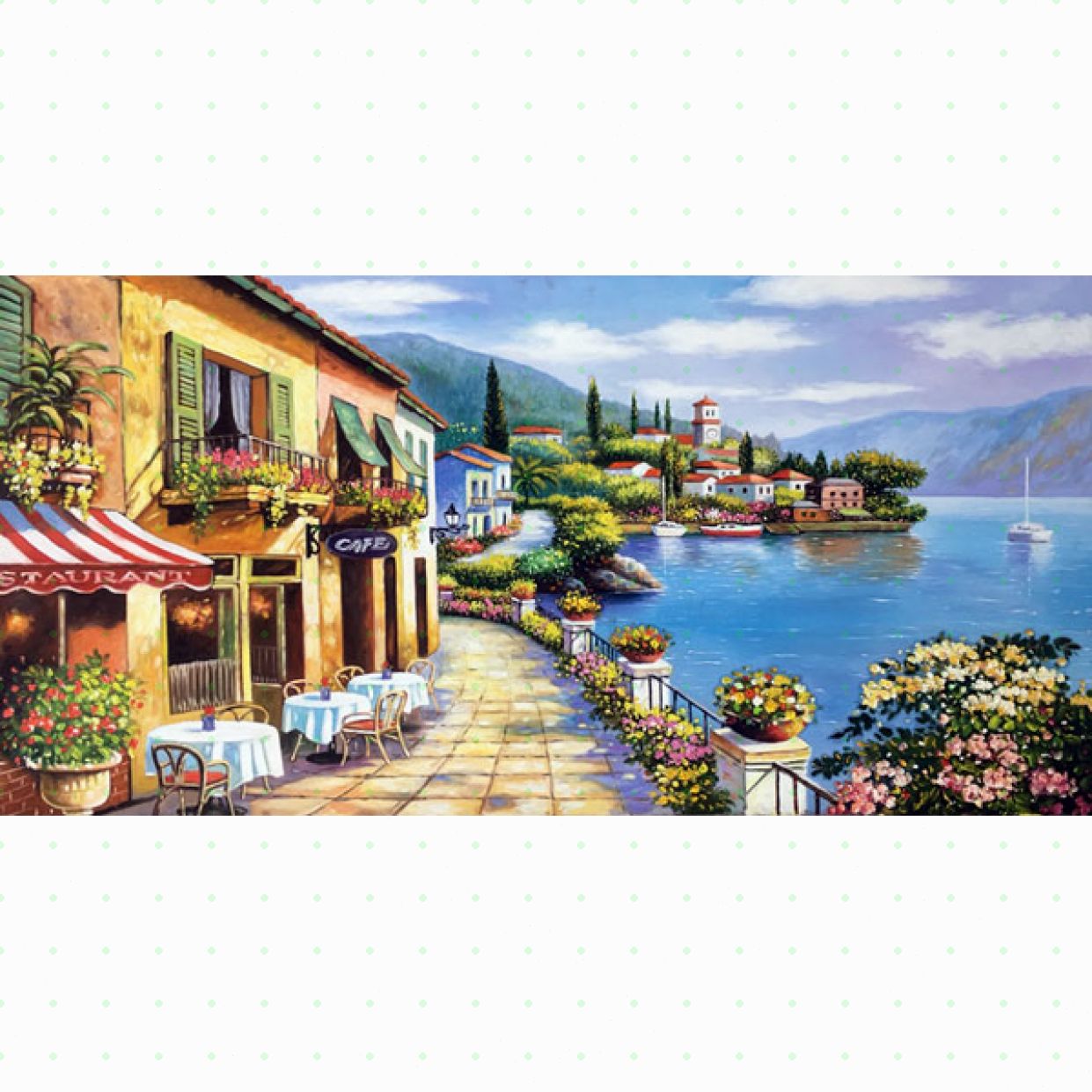 Không gian treo tranh sơn dầu vẽ phong cảnh thị trấn ven biển phòng khách